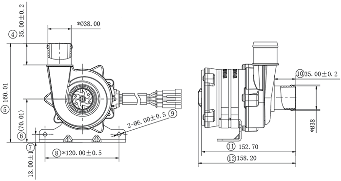 内容提示:一、产品应用: 1. 新能源热管理系统 2 新能源汽车电机电控冷却循环 二、产品特征: 1.重 量:1.8Kg 2.防护等级:IP67 3.绝缘等级:H级 4.使用寿命: 12000小时 5.进出水口直径:38mm 三、使用